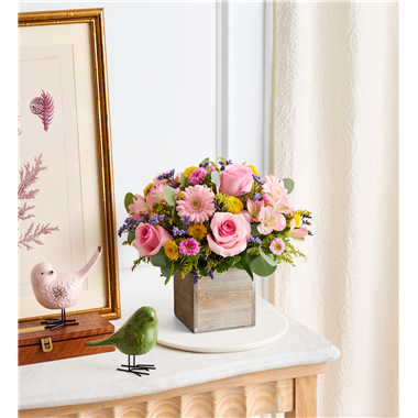 Spring is a time to refresh and reach out. Our spring bouquet celebrates that sentiment. Pastel pink and yellow blooms are loosely gathered with lush greenery for style and texture. Designed in our rustic, gray-washed wooden cube, it’s a gift that delivers on your feelings in the most beautiful way.